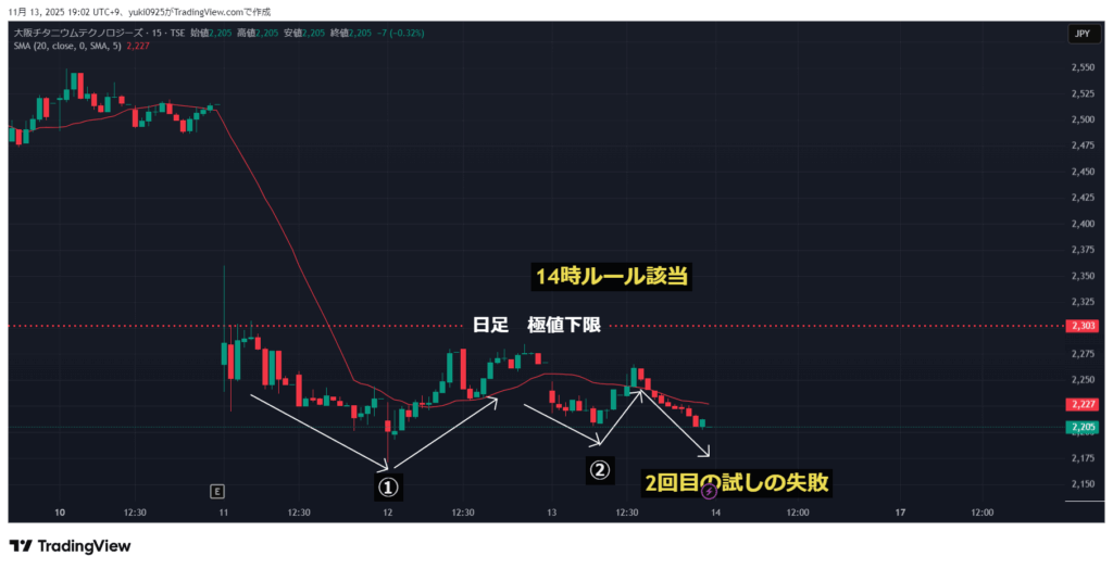 2. 2回目の試し:無。 安値②でいったん形成を試みたが、結果的に失敗(不成立