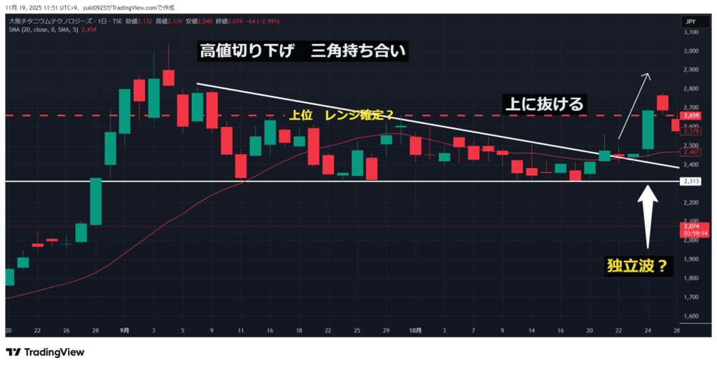 ・三角もちあいは下抜けると思っていた。大陽線で上抜けたのを確認し、2660円あたりで即損切りした。
