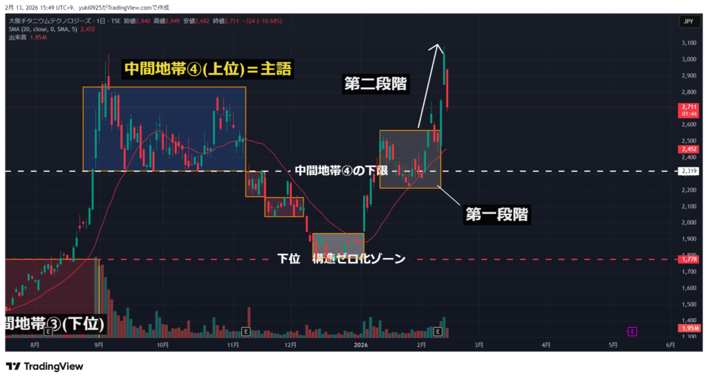 中間地帯④の下限(約2,300円付近)が重要支持帯。