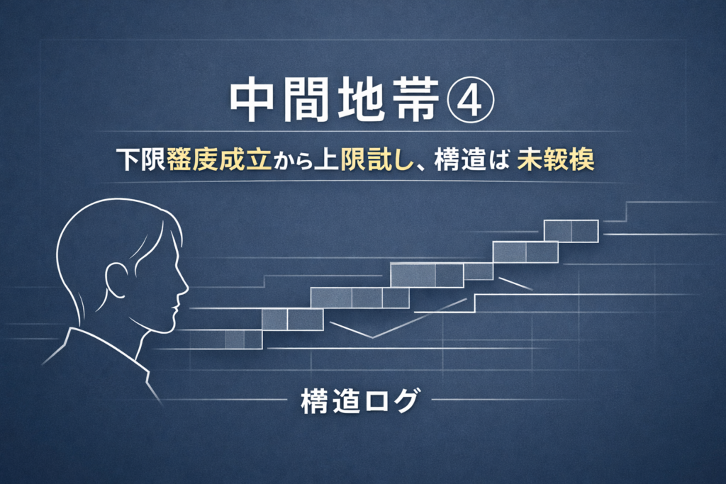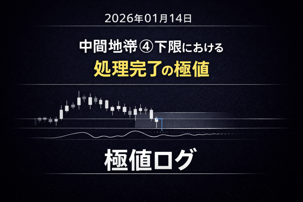【チャート】 日足 5分足 【■ 1. 問いの発生】 中間地帯④下限で密度が形成された後、価格は一気に④上限を試した。 その翌日、ほぼ全戻し。 ここで生じた問いは、 ④上限突破は母型③終了を意味するのか?第二撃は発生したのか? 【■ 2. 極値思考の前提】 極... 構造ログ